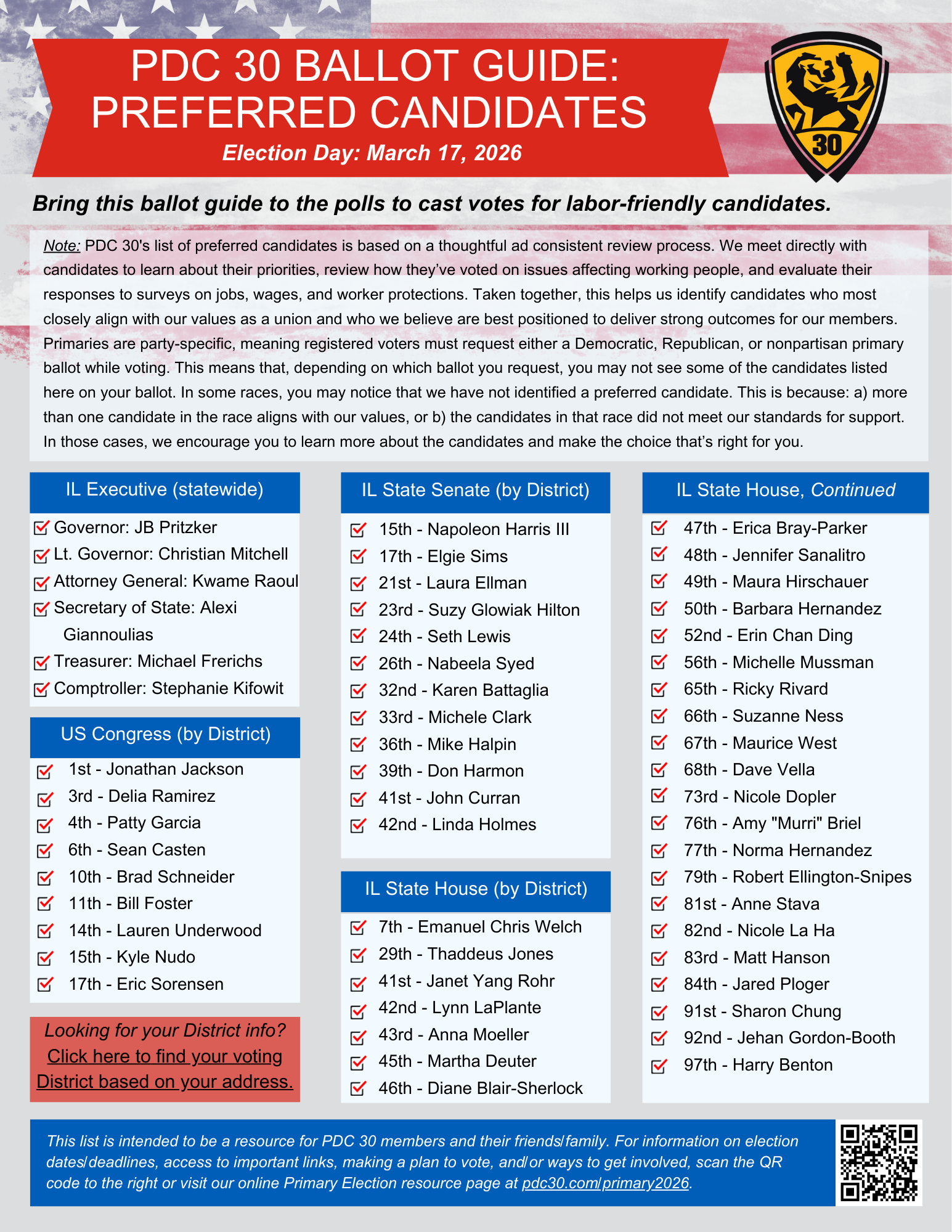Browse the tabs below for information about the 2026 Illinois Primary Election on March 17th, including important dates, assistance with making a plan to vote, ways to get involved, and PDC 30's endorsed candidates.